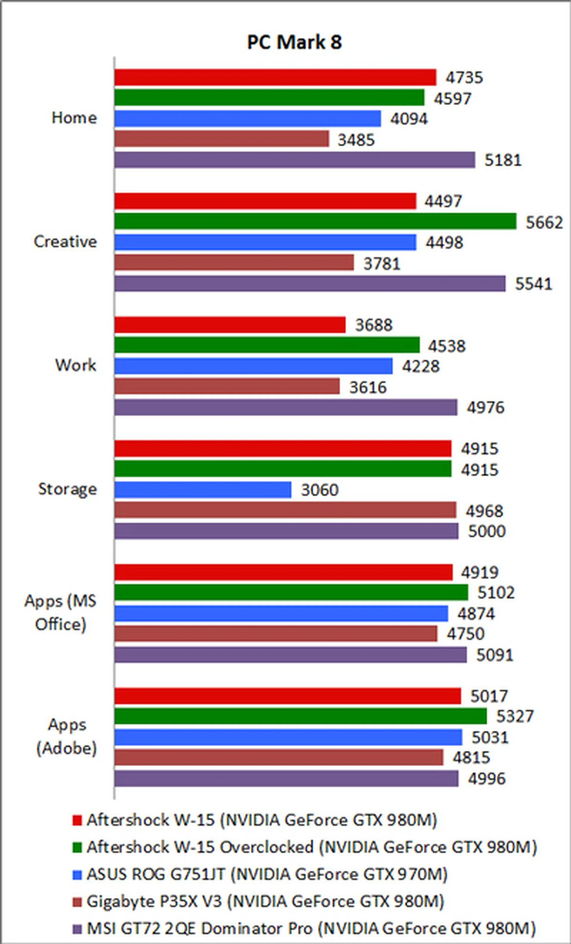 To be honest, we were surprised to see the Aftershock trailing the MSI Dominator Pro in some of the benchmarks. We'd pegged the desktop processor in the W-15 to actually help it outperform the other notebooks, regardless of test type in the general system benchmarks of PC Mark 8. Instead, apart from its performance in the Adobe and MS Office applications benchmark, the W-15 posted average scores on the other benchmarks. The biggest gap between the W-15 and the MSI GT72 2QE Dominator Pro came from the Creative test suite where the gulf between them was a massive 23% difference - until it was overclocked.