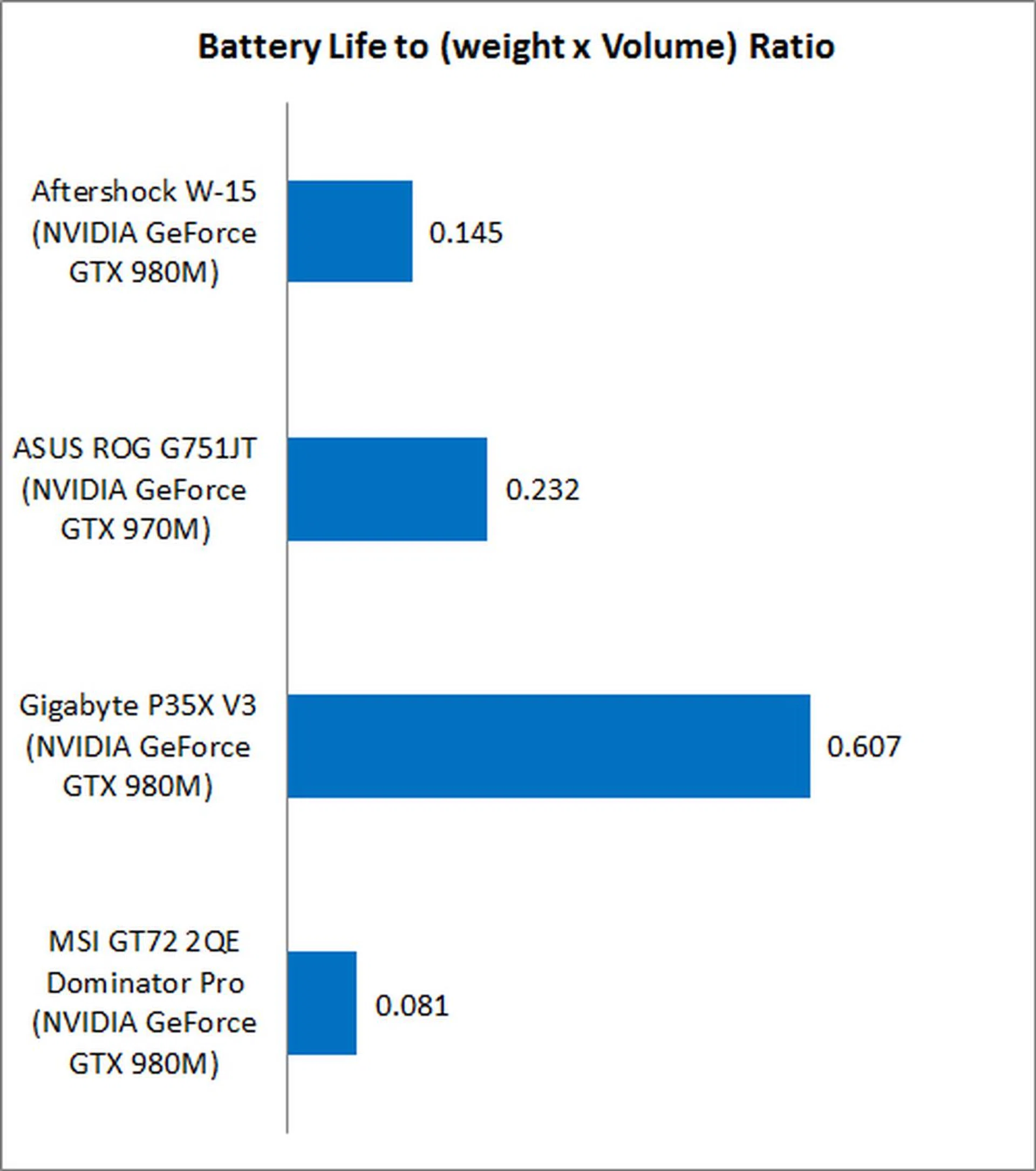 As we've mentioned in the past, the portability ratio takes into consideration the weight and volume of a notebook as well as the battery up-time. As such, the ratios are only really comparable within similar class of machines, such as the 15.6-inch Gigabyte P35X V3. In this comparison, the Aftershock W-15 stacks up poorly as it's clearly not made for portability and it is designed as a desktop replacement machine first and foremost. So the choice of components and build that it's endowed with directly contributes to the outcome in this segment.