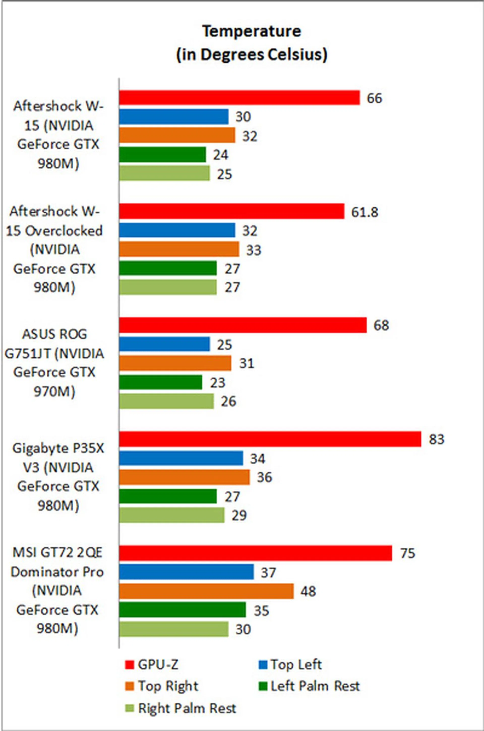 Even then, the results surprised us. The GPU-Z clearly showed the NVIDIA GeForce GTX 980M in the W-15 to be running incredibly cool, even when the W-15 is overclocked. We took the readings after letting the Tomb Raider benchmark (set to Ultra) run after 30 mins, same as the other benchmarks and GPU-Z showed that the graphics card was actually running cooler than when the machine is not overclocked. Aftershock's cooling system does work as intended and then some! The Aftershock W-15 is pretty much as warm (or cooler in some cases) as the Gigabyte and MSI machines in the comparison.