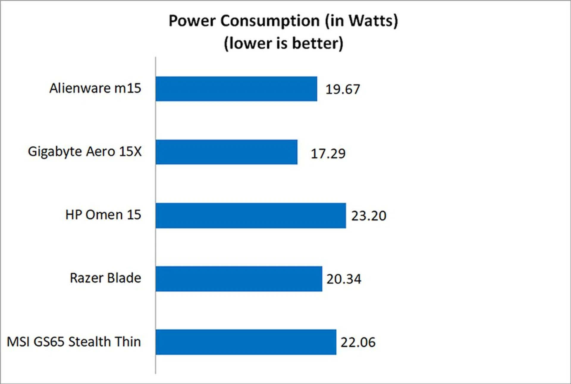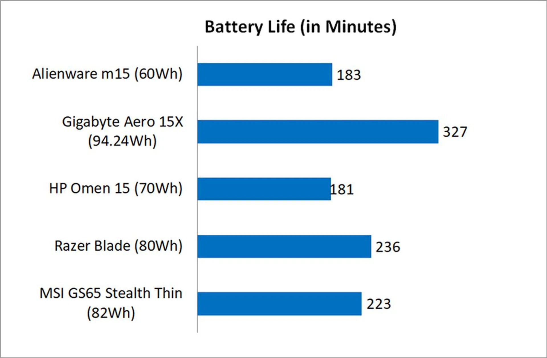 The Alienware m15 is actually pretty power efficient, coming in second only to the Gigabyte Aero 15X. Despite that, its 60Wh battery is still on the smaller side, and it can't really compete against the notebooks with 80Wh batteries or larger. That's a pity, considering that the m15 is also thicker than those laptops. Alienware does have the option for a larger 90Wh battery, which should really have been included by default.