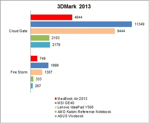 Clearly, the new Intel HD Graphics 5000 integrated GPU is a completely different animal when compared to its predecessor - the Intel HD Graphics 4000. The new MacBook Air scored 4644 on the Cloud Gate benchmark which was comfortably double that of both the AMD reference Kabini notebook and the ASUS VIvobook X202 - the latter has an Intel HD Graphics 4000 integrated GPU. While the Intel HD Graphics 5000 is much improved over its predecessor, it was no match for the MSI GE40’s discrete NVIDIA GTX 760M graphics engine.