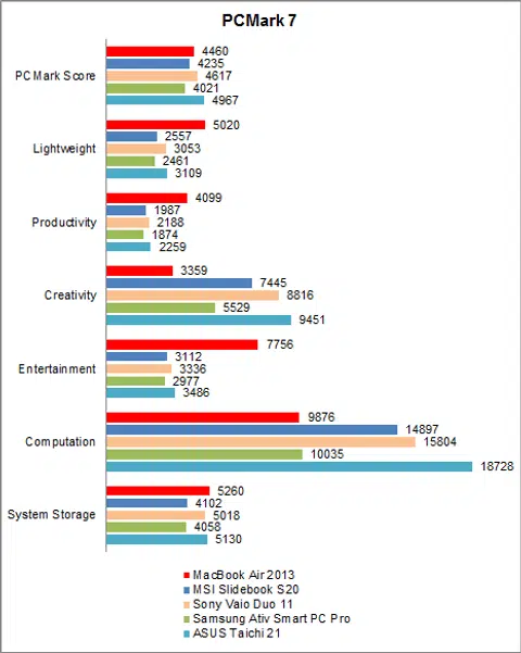 Comparing the new MacBook Air against some of the latest Ultrabooks and hybrids that are powered by comparable processors, we can see that the new MacBook Air is competitive. Its overall score of 4460, puts it right smack in the middle pack. It was bested only by the Sony Vaio Duo 11 and ASUS Taichi 21, which have beefier Core i7-3517U processors. The Sony Vaio Duo 11 also has double the amount of memory.
