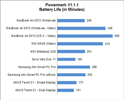 Although the new MacBook Air has not changed radically, Apple has provided it with substantial upgrades under the hood. Thanks to the new Core i5-4250U processor and marginally larger battery, the MacBook Air now has even longer battery life. Even though its showing on Powermark was slightly underwhelming, considering Apple’s lofty claims, we found that it was entirely possible to achieve and exceed 12 hours if you used the MacBook Air as Apple has intended.