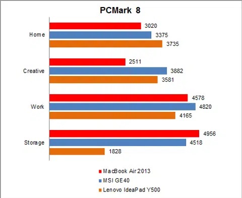 Since PCMark 8 is still new and we could not recall the rest of the notebooks for re-evaluation, we will only be looking at the results of the new MacBook Air along with the recently reviewed MSI GE40 and Lenovo Y500. However, rest assured we will be populating this list moving forwards in future reviews.