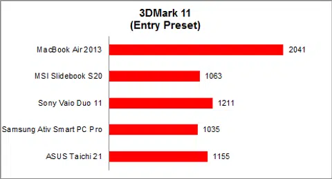 Next, we took a step back to run 3DMark 11 where we've more comparable results from other Windows Ultrabooks. Here, we can see that new MacBook Air and its more powerful Intel HD Graphics 5000 integrated GPU has the upper-hand against last generation’s models - all of which were using Intel HD Graphics 4000 core. Its score of 2041 was almost double that of all the other contenders.