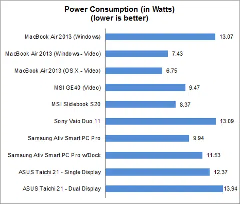 Using Powermark (in the the Windows environment), we managed 4 hours and 8 minutes, which is respectable but not fantastic. In terms of power consumption, it achieved just slightly over 13W and this puts it at around the same mark as the Sony Vaio Duo 11. This is pretty decent considering the Sony Vaio Duo 11, as well as the other hybrids, have smaller 11.6-inch displays.