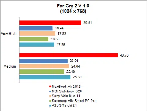 Moving to real-world gaming benchmarks, the new MacBook Air was the undisputed leader in Far Cry 2, racking up nearly double the frame rates when compared to last generation’s Ultrabooks and hybrids.
