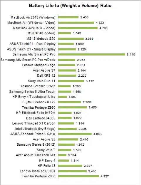 Our Portability Index factors in battery life, weight and volume so you can see which notebook is the most worthwhile to carry around. The MacBook Air’s portability score is one of the best in its class thanks to its impressive battery life and also its compact dimensions and light weight. Whichever workload you compare, it bests all of the last generation Ultrabooks of the same form factor.