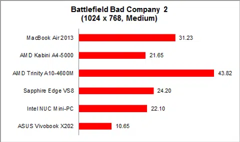 On Battlefield Bad Company 2, the MacBook Air retained its lead over the other systems with the Intel HD Graphics 4000 integrated GPU and managed to attain just above 30 fps. However, it was bested by the AMD reference Trinity notebook, which was running an A10-4600M APU which has a Radeon HD 7660G integrated GPU. Having said that, a notebook based on a high-speed Trinity APU cannot match the slim build of the MacBook Air.