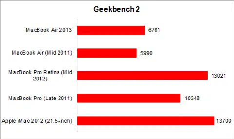 The new MacBook Air recorded a score of 6761, which represents a 12% improvement over a Mid 2011 MacBook Air. However, when compared to the newer MacBook Pro Retina and iMac from last year, we can see that there is a significant gulf in performance.