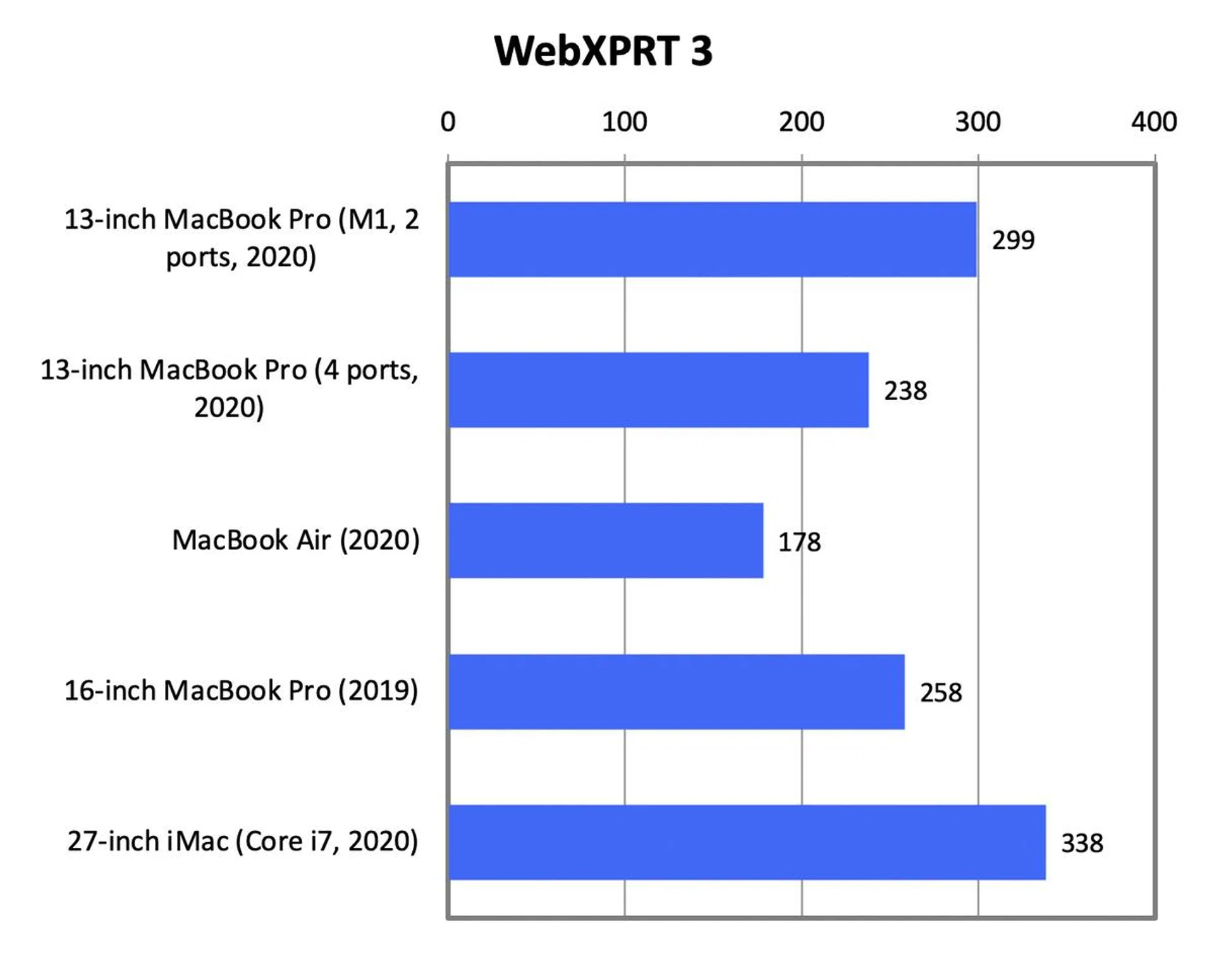 The M1 13-inch MacBook Pro's score of 299 puts it well above any other MacBook, including the 16-inch MacBook Pro with a Core i9 processor. It was only outperformed by an iMac with a desktop-class Core i7 processor. But even then, the iMac didn't outdo the M1 13-inch MacBook Pro by much.