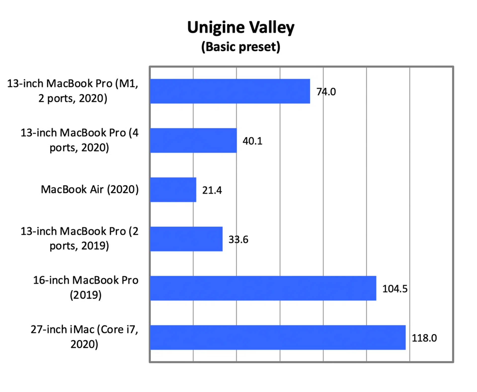 The M1 13-inch MacBook Pro was leaps ahead of any Mac with integrated graphics. It was about 85% faster than the 2020 Intel-based 13-inch MacBook Pro with Intel Iris Plus graphics. The 16-inch MacBook Pro still has the advantage thanks to its Radeon Pro 5500M GPU but its lead isn't as big as it should have been considering that it's a powerful mid-range mobile GPU.