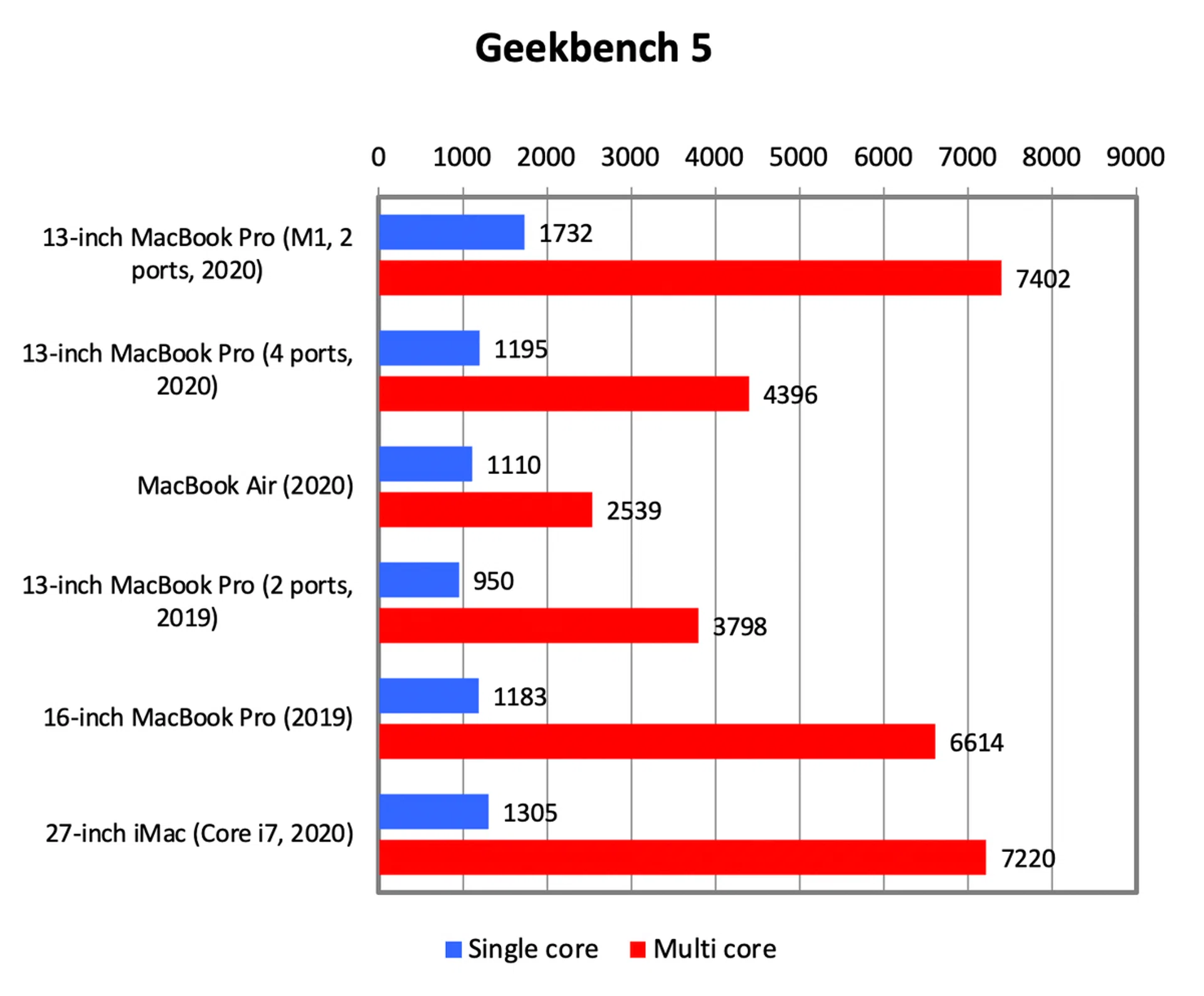 With a score of 1480, the M1 13-inch MacBook Pro recorded the highest single-core scores of any Mac we have tested – that's nearly 23% greater than a 2020 iMac with a Core i7 desktop-class processor. It's multi-core scores were impressive as well. It was just a smidge less than a 16-inch MacBook Pro which has a Core i9 processor. And as you can see, the Intel-based 13-inch MacBook Pro that was released earlier this year was no match at all.