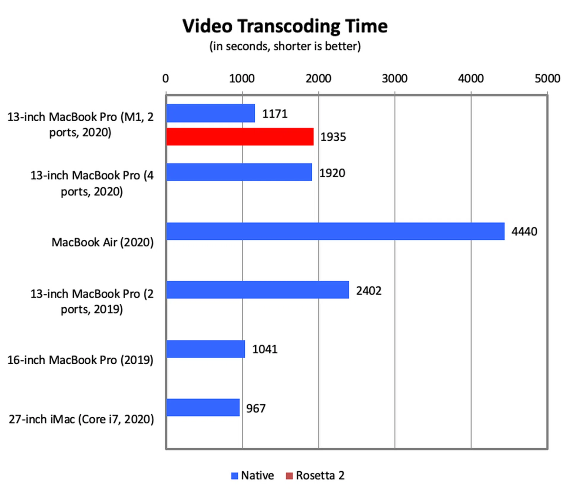 The results are, again, impressive. Even while running via translation, the new M1 MacBook Pro took just about as long as the latest Intel 13-inch MacBook Pro. But when running natively, the M1 MacBook Pro took a considerably shorter amount of time to finish the task and wasn't too far off from a 16-inch MacBook Pro with a Core i9-9880HK processor that has roughly double the TDP.