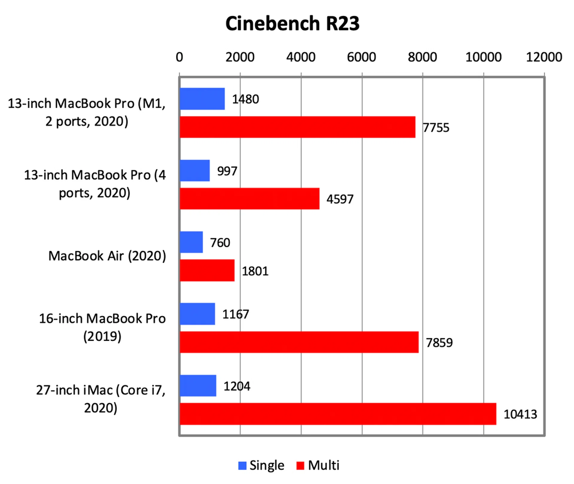 Cinebench measures the rendering performance of a CPU. We are using the latest version, R23, which has been compiled to run natively on M1 Macs.