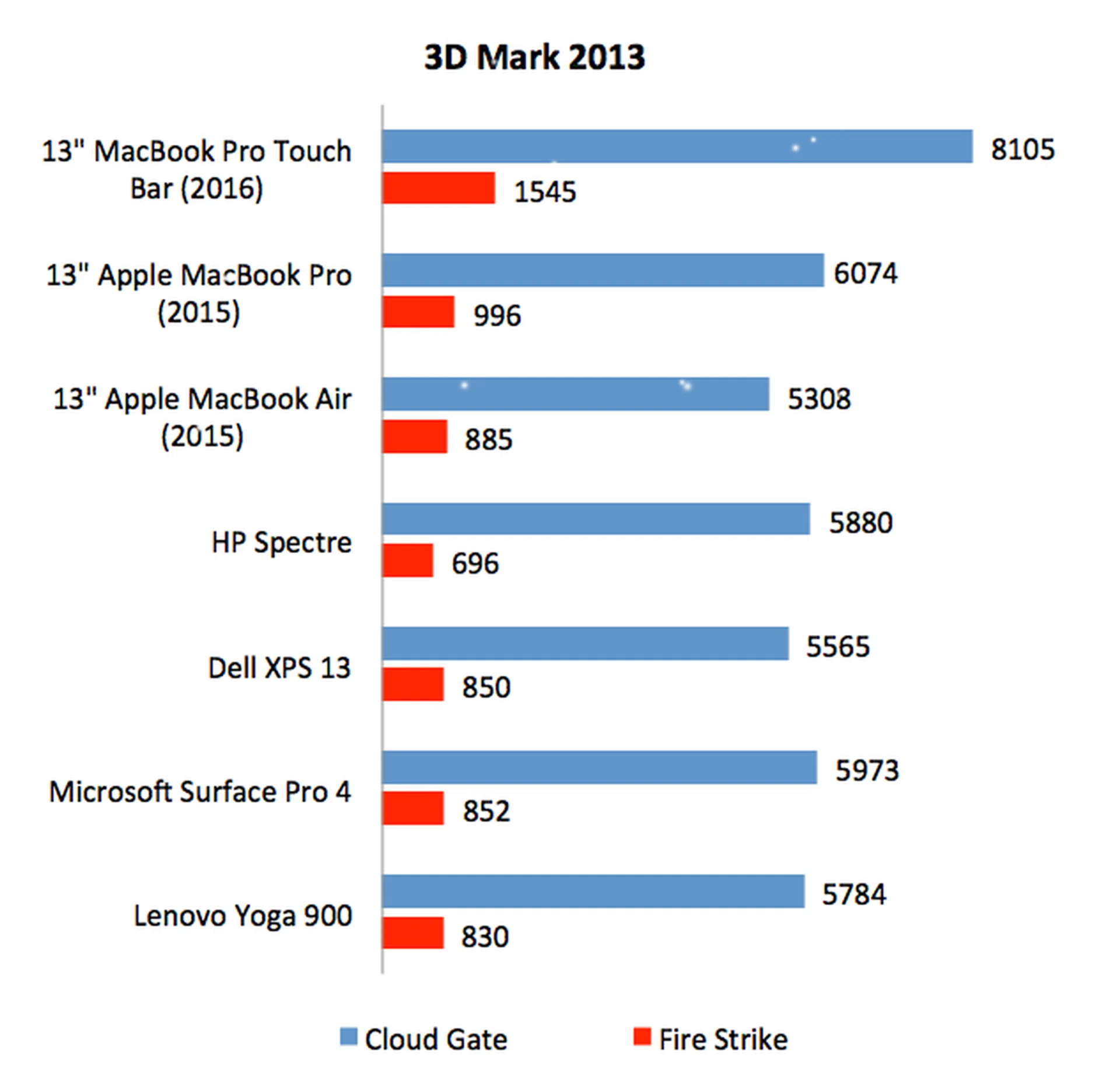 According to Apple, the new 13-inch MacBook Pro provides up to 103% faster graphics performance than last year’s model, and the results on 3DMark confirms that graphics performance has been dramatically improved. The new MacBook Pro recorded substantially higher scores than last year’s model. On Cloud Gate, it scored over 33% more; and on Fire Strike, its score was over 55% higher. The new MacBook Pro was the highest scoring notebook here by a fair margin.