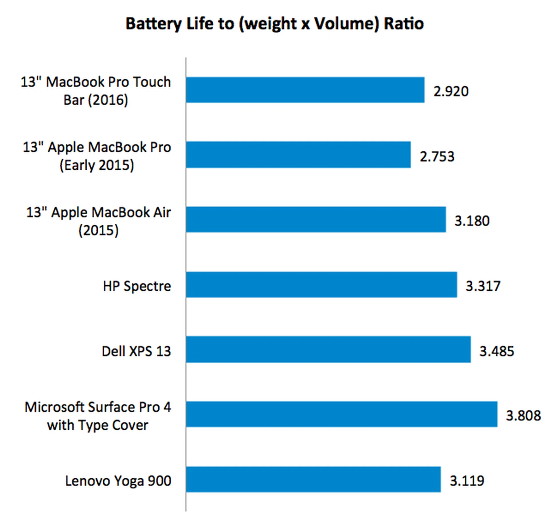 Our Portability Index factors in battery life, weight and volume so you can see which notebook is the most worthwhile to carry around. The scores for the new MacBook Pro and last year’s model were quite similar. Even though the new MacBook Pro has a much shorter battery life, it managed a slightly higher score thanks to its lighter weight and smaller overall volume. In terms of overall volume, the new MacBook Pro is about 23% smaller. If portability is high on your priority, the MacBook Air is still superior. But if you don’t mind using Windows, then the new breed of Windows notebooks are worth checking out, because they score even higher.