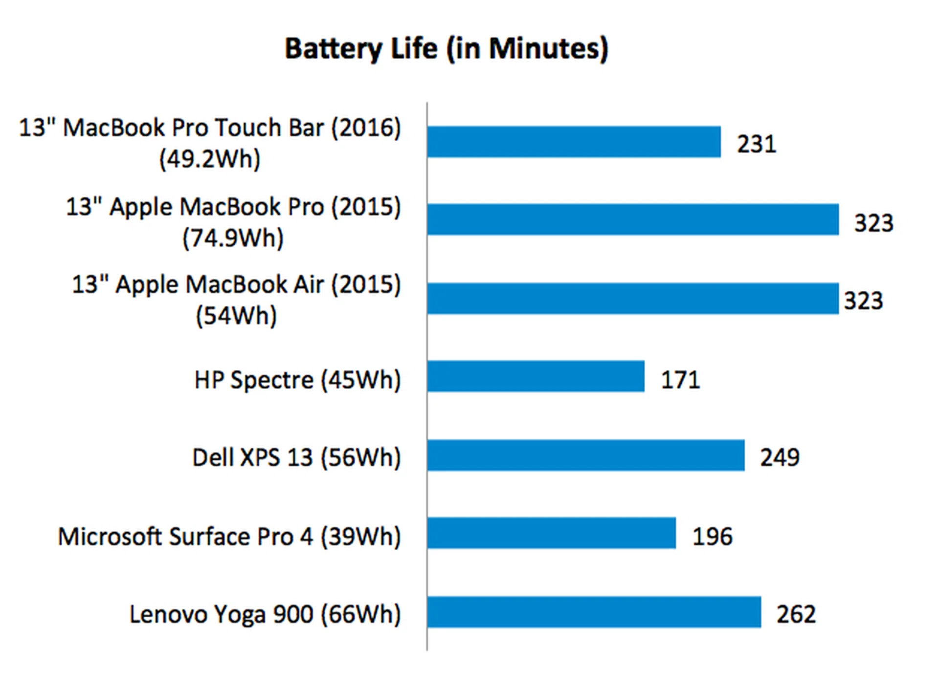 An interesting thing to note about the new MacBook Pro is that it has a substantially smaller battery compared to last year’s model. While last year’s model came with a 74.9Wh capacity battery, this year’s model only has a 49.2Wh capacity battery - a reduction of over 34%. The 2015 MacBook Pro has one of the largest battery of any 13-inch notebook, but this is no longer the case.