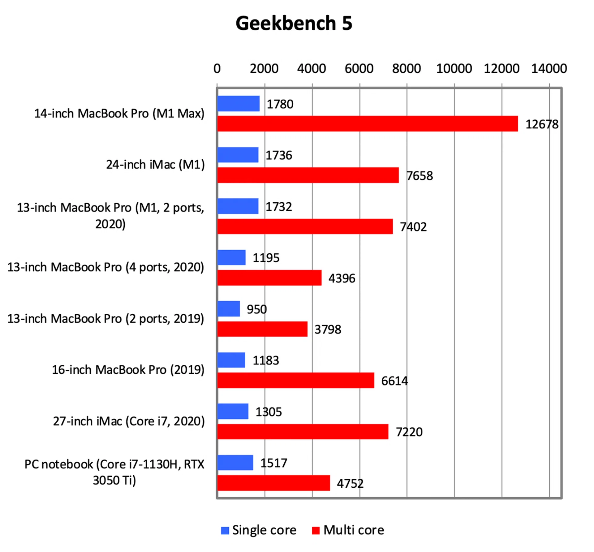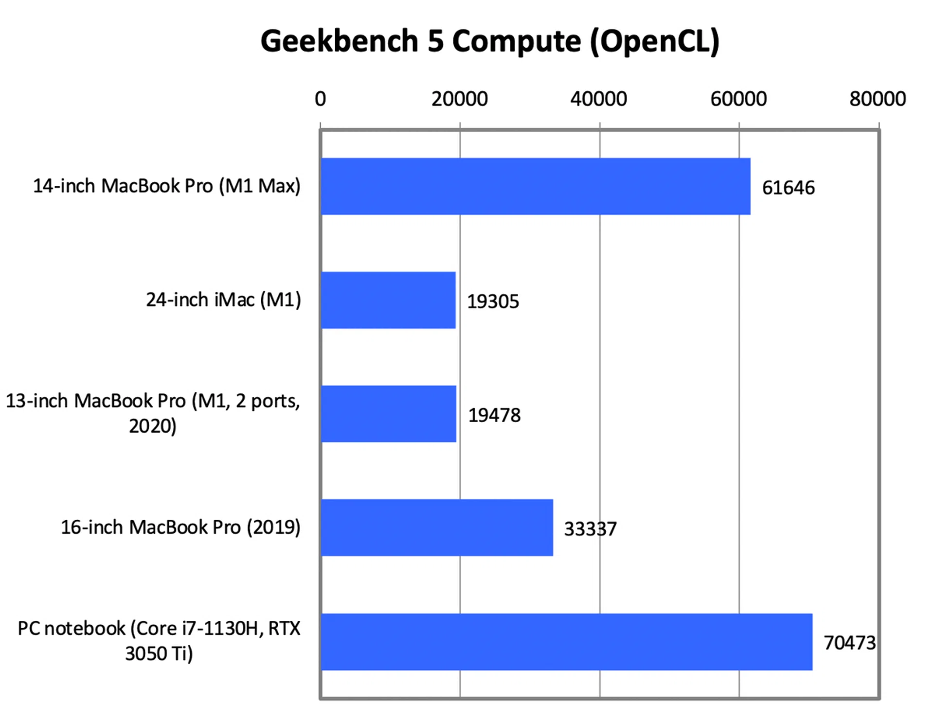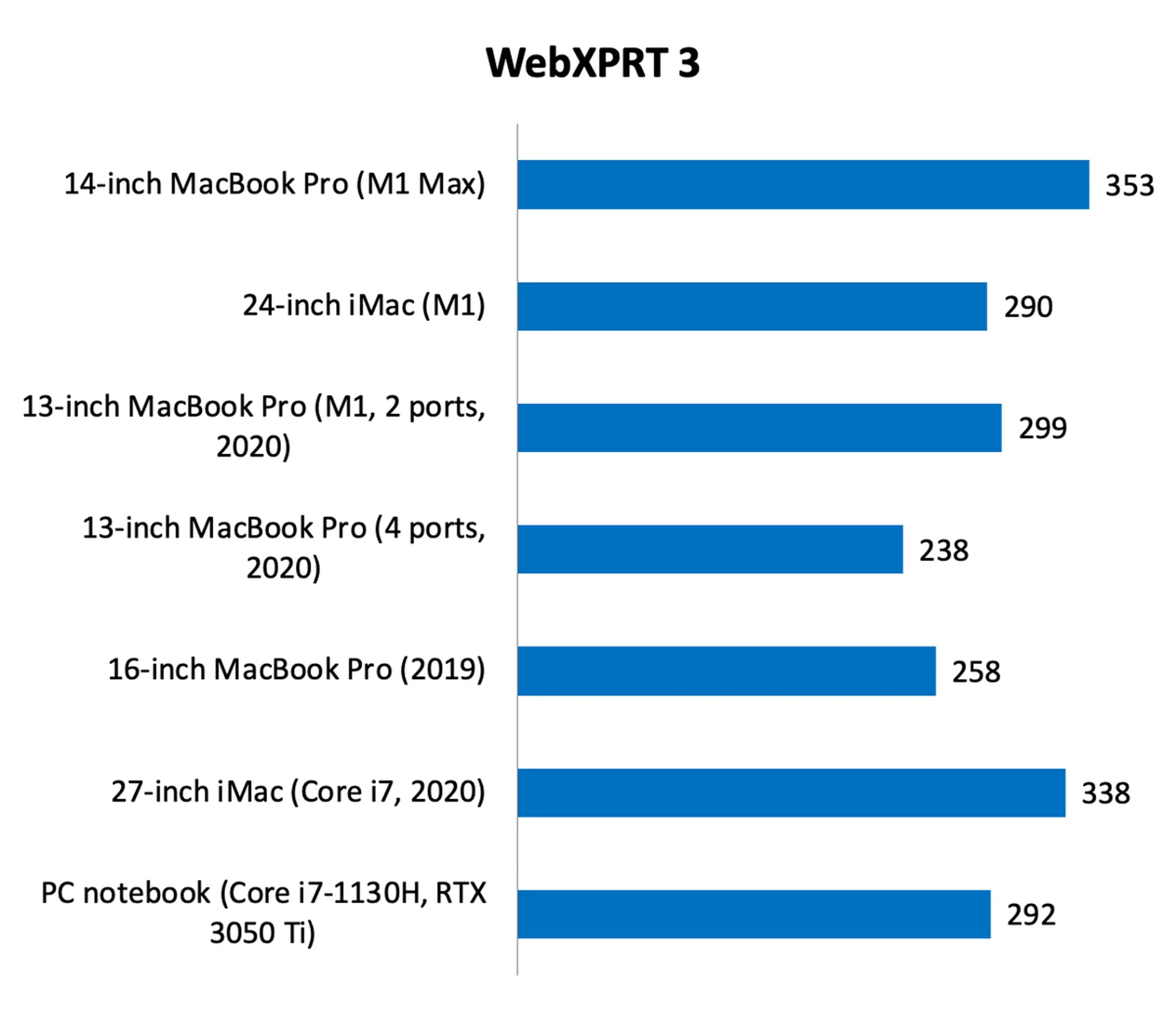 Unfortunately, I won’t be able to test this since I only have the 14-inch MacBook Pro. This particular unit I have has the full-fat M1 Max chip with 10 CPU cores, 32 GPU cores, the maximum 64GB of memory, and a 2TB SSD. Now let’s take a look at how it performs against other recent Macs. I have also included results from a PC notebook that has a Core i7-1130H processor with 16GB of memory and GeForce RTX 3050 Ti graphics.