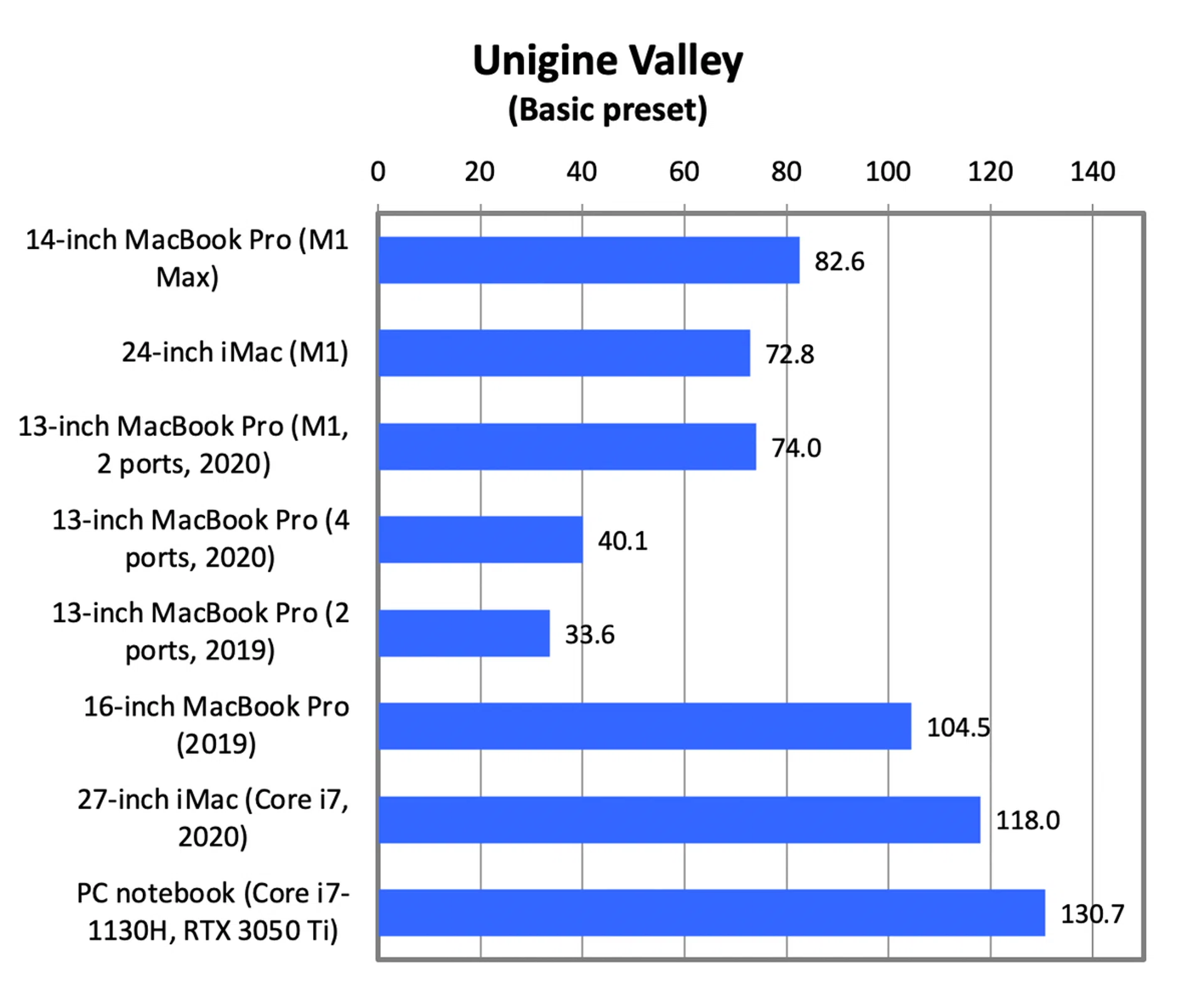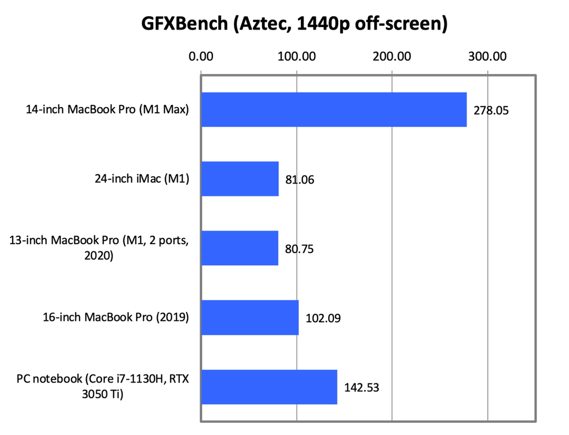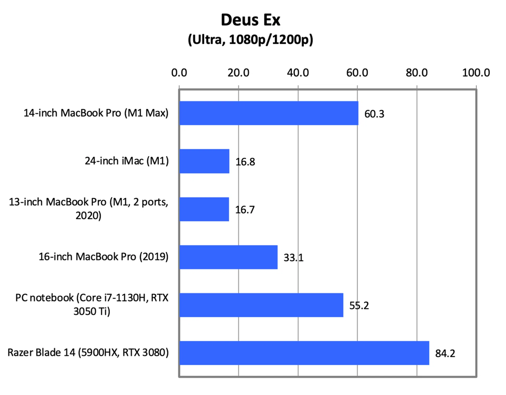 Seeing that these games are not optimised for Apple Silicon and the 14-inch MacBook Pro is forced to run them in Rosetta 2, it’s not surprising to see the 14-inch MacBook Pro falling behind the Blade 14. The Blade 14 was about 40% faster in both games. What’s more instructive perhaps is that the 14-inch MacBook Pro is over 3.5 times faster than the M1 13-inch MacBook Pro and 24-inch iMac, which demonstrates just how much more graphics performance the M1 Max has over the regular M1.