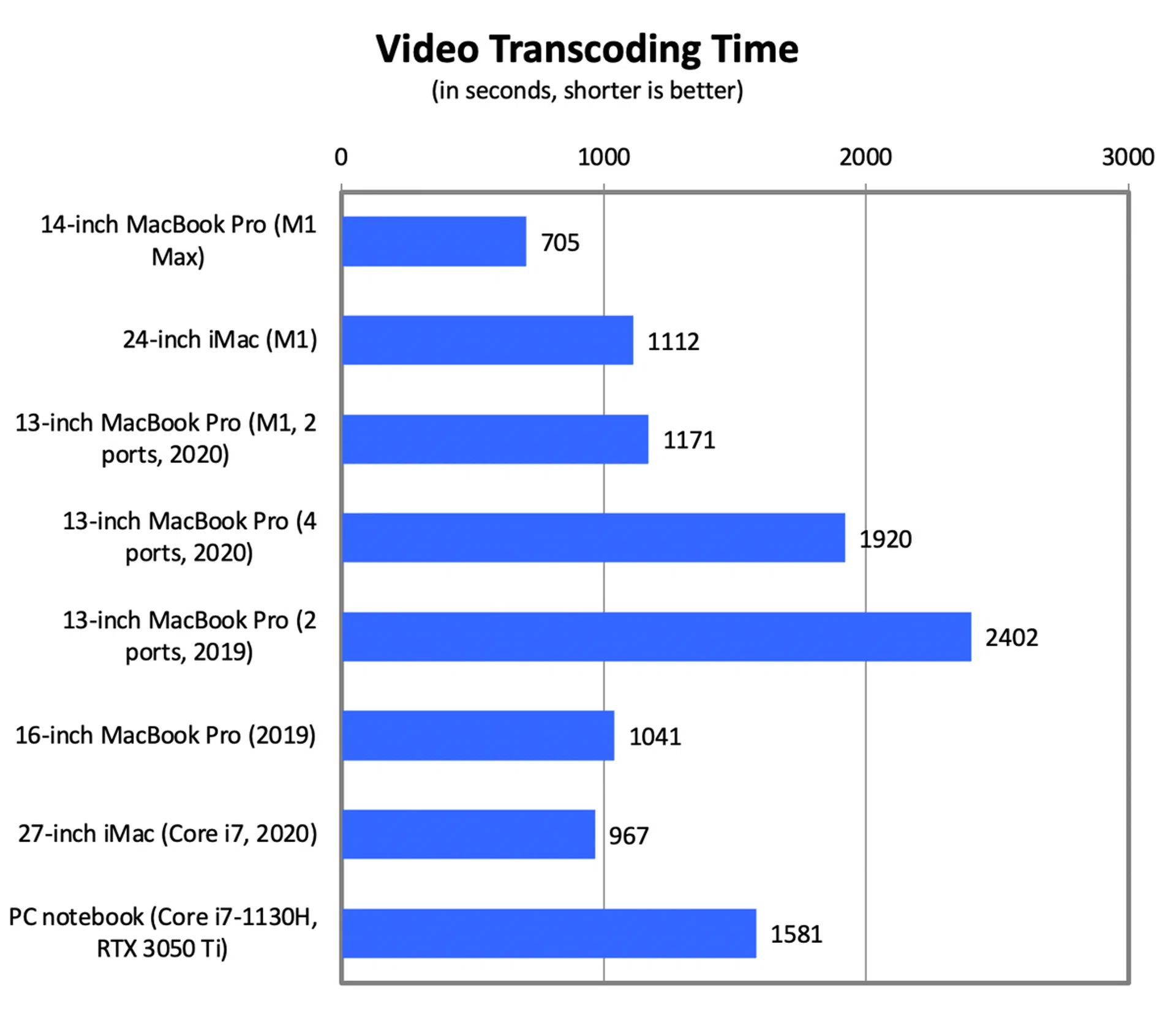 On our video transcoding test, which measures the time taken to transcode an hour-long Full-HD video, the 14-inch MacBook Pro took just under 12 minutes, which is 27% faster than even last year’s 27-inch iMac which has a fairly high-end desktop-class Core i7-10700k processor. It’s over 30% faster than M1 systems and even the last-generation 16-inch MacBook Pro which has a high-end Core i9 mobile processor.