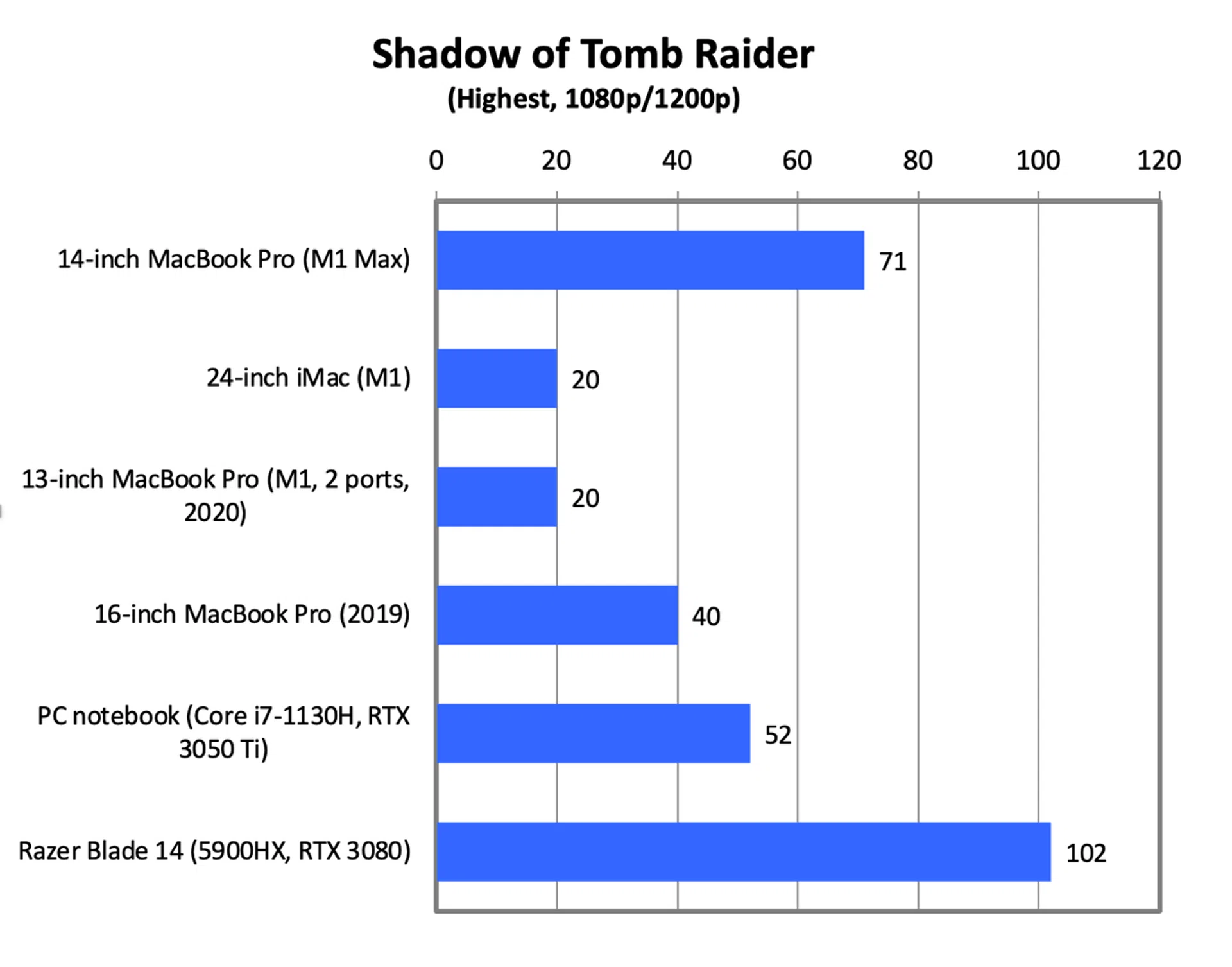 Many readers asked about gaming so I ran Shadow of the Tomb Raider and Deus Ex. These games were chosen because they run on both PCs and Macs, which gives us a chance to compare the 14-inch MacBook Pro’s performance against PC notebooks. Apple claims the M1 Max can just about match the graphics performance of a high-end PC notebook with GeForce RTX 3080 graphics, so we are including results from the Razer Blade 14 which just so happens to have GeForce RTX 3080 graphics paired with a high-end AMD Ryzen 9 5900HX processor.
