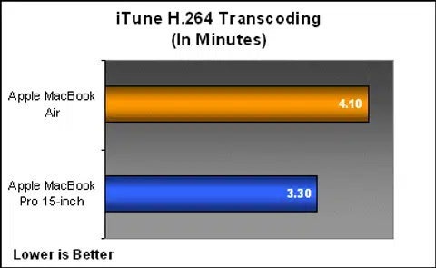 For a real world scenario that requires some processing power, we use iTunes to compress and encode a QuickTime movie using the 'Convert Selection for iPod' option. The file chosen for compression was a 197MB H.264 encoded 1080p QuickTime Trailer of Iron Man. The MacBook Air took a 4min 06sec complete the conversion, while the MacBook Pro managed the same conversion in 3min 18sec.