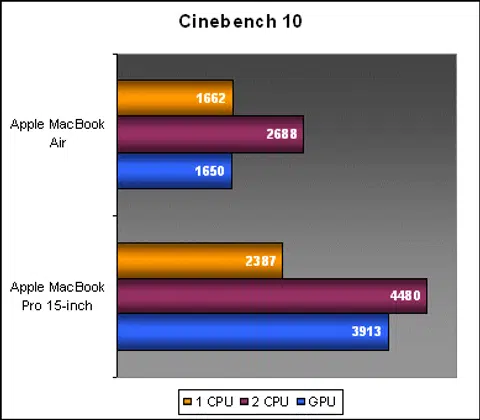 With a 600MHz gap, the MacBook Air looks pretty slow when compared to the MacBook Pro in terms of Cinbench's CPU scoring. In real time, the gap between the two notebooks was around two minutes for both single and multi-threaded tests. As for the OpenGL graphics benchmark, it is only expected that the GeForce 8600M GT on the MacBook Pro would trounce the onboard Intel GMA X3100.