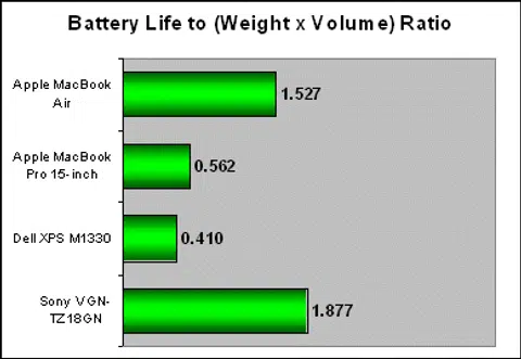 From the graph below, the MacBook Air is in excellent shape as one of the highest portability ratings we've come across in quite a while. So, while it may seem that you get short changed in battery life compared to a full-fledged MacBook Pro, the MacBook Air is really a much more ideal travel companion, though it is still no match for the .