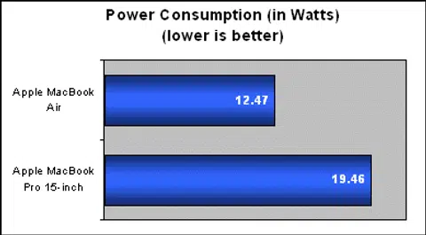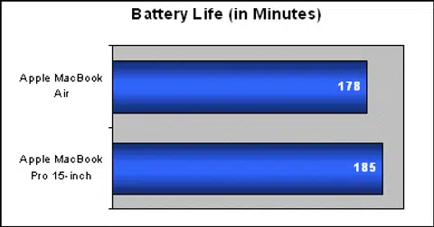 Compared together, both the MacBook Air and MacBook Pro were almost similarly matched. While a three hour run-time for the powerful MacBook Pro is decently impressive, the MacBook Air comes off short. This is much less than Apple's five hour claim, but we do expect battery life to last at least four hours or more with a less intensive usage model, such as surfing the net or office productivity. Still, if you look at the power consumption chart, the MacBook Air sucks less energy on average, but because of its smaller battery size (37 watt-hour) compared to the MacBook Pro (60 watt-hour), we still end up with similar battery performance overall.