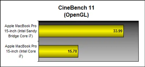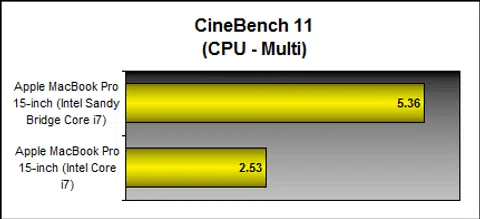 On the productivity and creation side of OS X, we used Cinebench 11 to give you an idea on the performance improvements derived from the new Intel Sandy Bridge hardware. As you can see, the newer notebook scores double of the previous notebooks, due to the better hardware and software optimization of the OS. If you held off buying the previous Intel i7 machine for the Sandy Bridge version, based on the results, we're guessing that you're probably a happy owner of the latest edition.