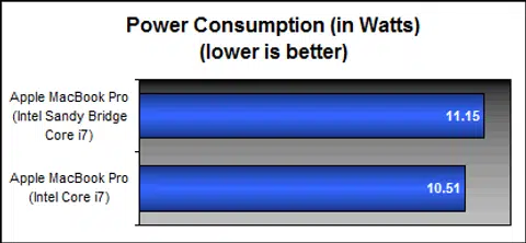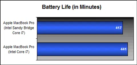 Surprisingly, our DVD battery test where a movie DVD is looped nonstop until the notebook dies while keeping screen brightness and volume to 50%, showed the 15-inch notebook lasting just three minutes shy of the 7 hour mark, which is pretty darn impressive for a non-netbook device. Oddly, even though the battery performance should be better due to the more energy efficient Intel Sandy Bridge processor, we're seeing the notebook lasting about 24 minutes shorter than the previous generation MacBook Pro. This could be due to a more powerful discrete GPU used. While 24 minutes may seem like a long time for notebooks with a much shorter battery life, for notebooks with over close to 7 hours of battery uptime, it's not much of a difference.