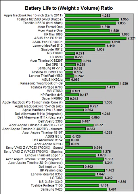 Our portability index test takes the battery uptime divided by the product of the unit's weight and volume and the resulting figure is a ratio that we use to determine how portable a unit is. The higher, the better and is used to specifically compare products of the same class.