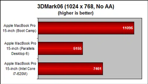 Our 3DMark06 run on PD6 was marred by some weird driver bugs that caused the discrete graphics to freeze, but after some patching with Apple's fix, we found the system to be much more stable and less prone to an unrecoverable freeze. Results wise, your best bet for performance is to run your games in Boot Camp.