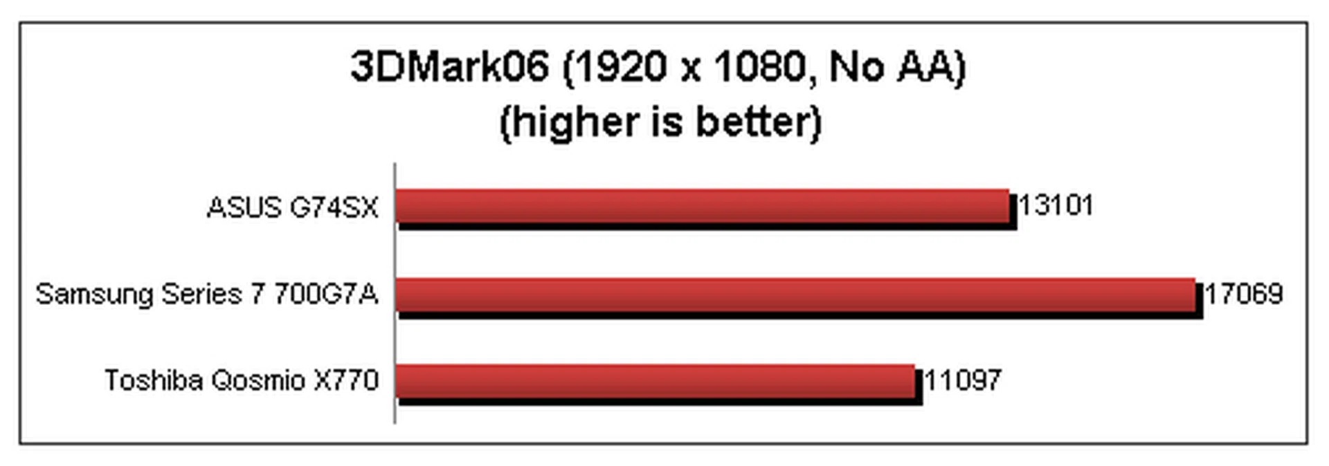 3Dmark06 tests a unit’s GPU (and involved some aspects of the CPU too). While the NVIDIA GTX 560M found in the G74SX has a whopping 3GB of VRAM, it only slightly outperformed the 1.5GB VRAM in the X770, proving the age-old understanding that VRAM doesn't actually make that much of a difference to a system’s performance. In fact, the differential is mostly due to the X770's slower CPU. The high-end AMD Radeon HD 6970M GPU with 2GB VRAM on the Samsung machine attained a much higher score than either NVIDIA models.