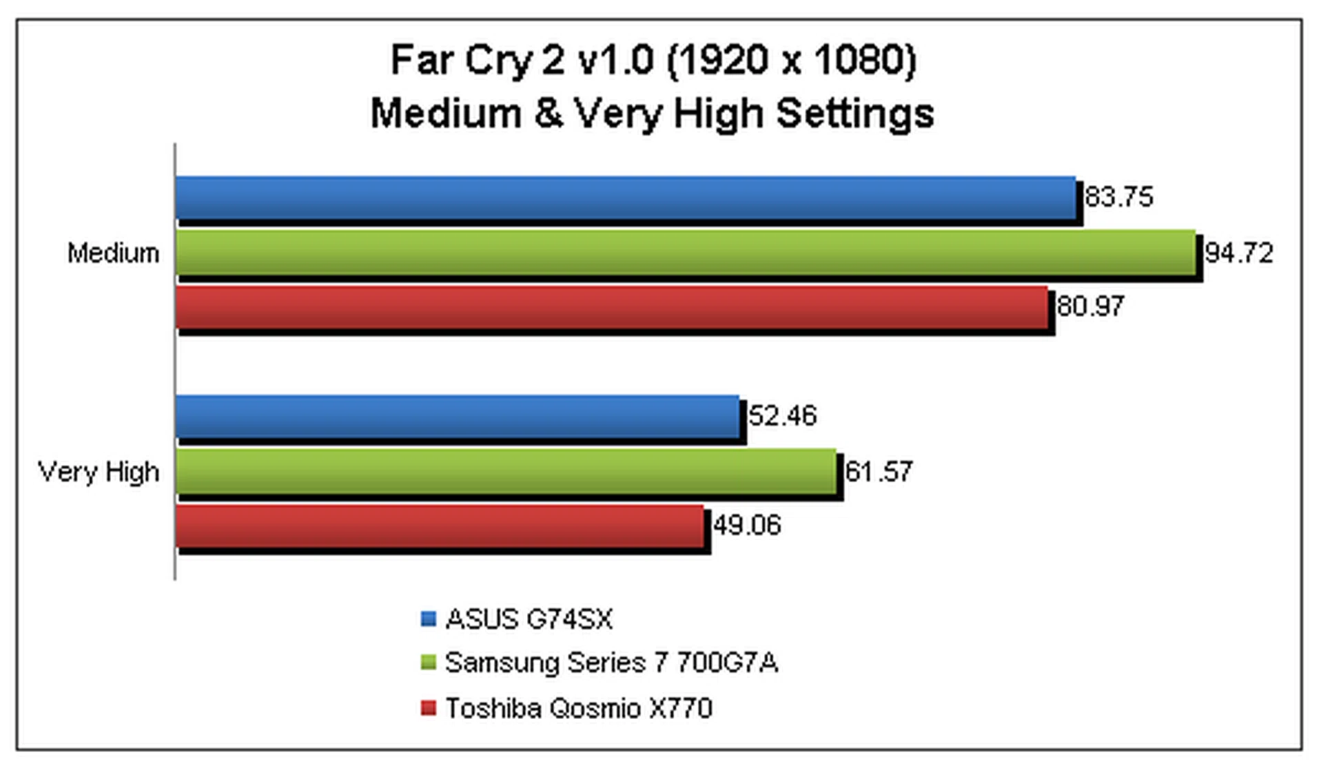 Unfortunately, in terms of actual in-game frame rates, the hybrid drives' advantage was hardly felt and the G74SX scored only a nary better than the X770 by virtue of a speedier CPU. It goes without saying that the Samsung 700G7A was ahead of the compared machines. When comparing game play on the ASUS machine against the Samsung, on Very High settings, there was a small but noticeable decrease in frame rates between the two, although having said that, frame rates were still well above acceptable for game play.