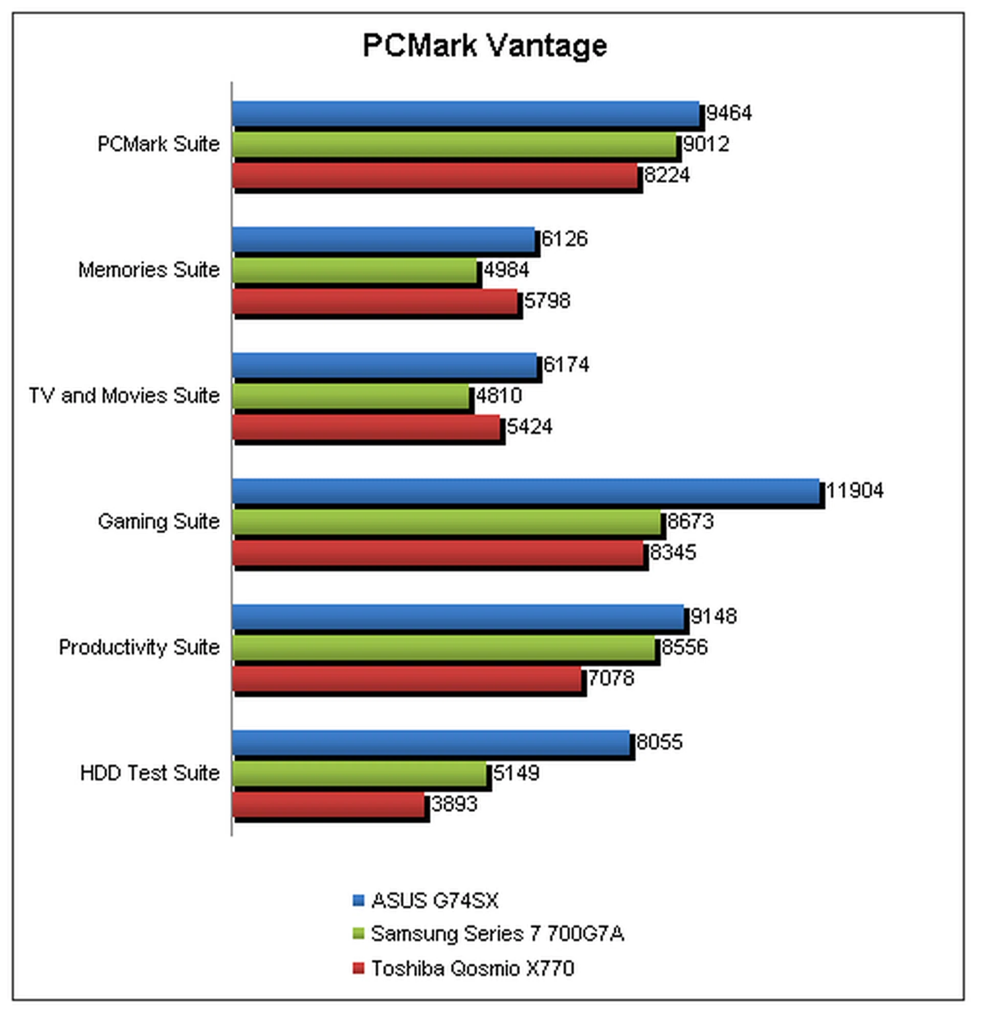PCMark Vantage tests the overall performance of a system. The G74SX scored surprisingly well, winning in every category and notably achieving a massive 11904 score in the Gaming Suite. So while the numbers look great, the important point here is to understand what the benchmark does to derive these scores.