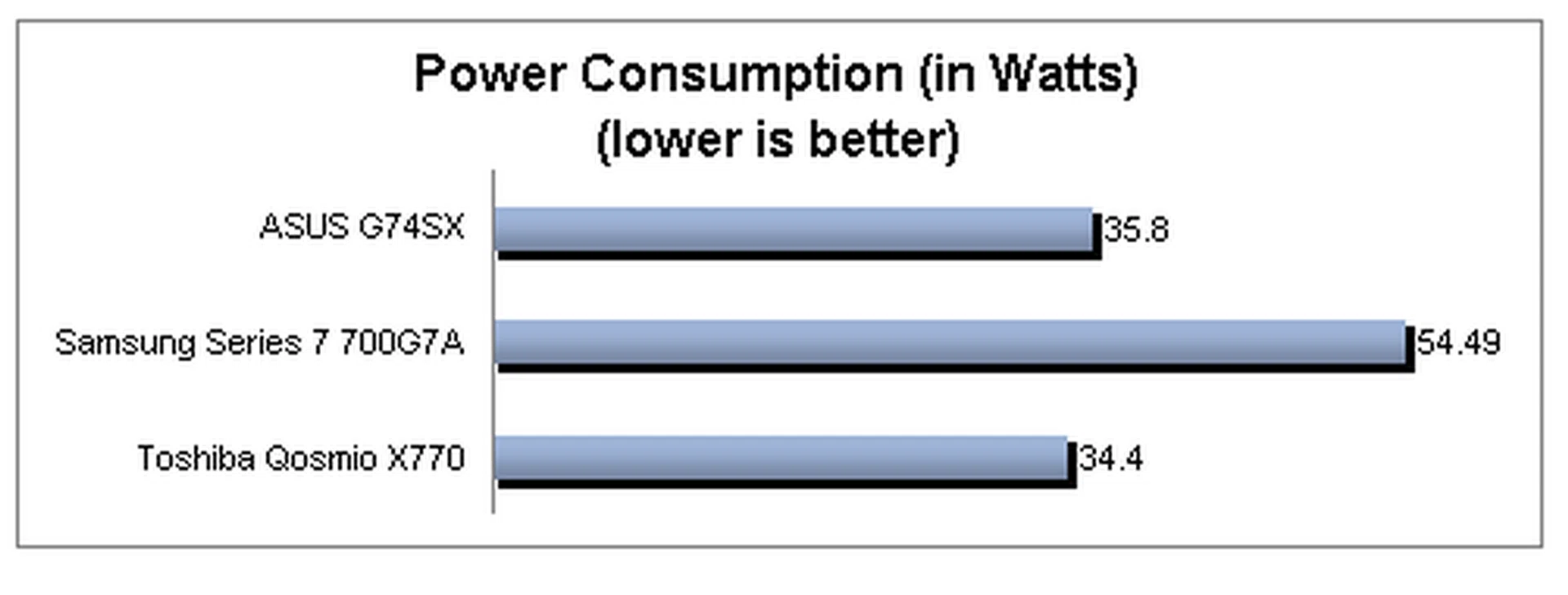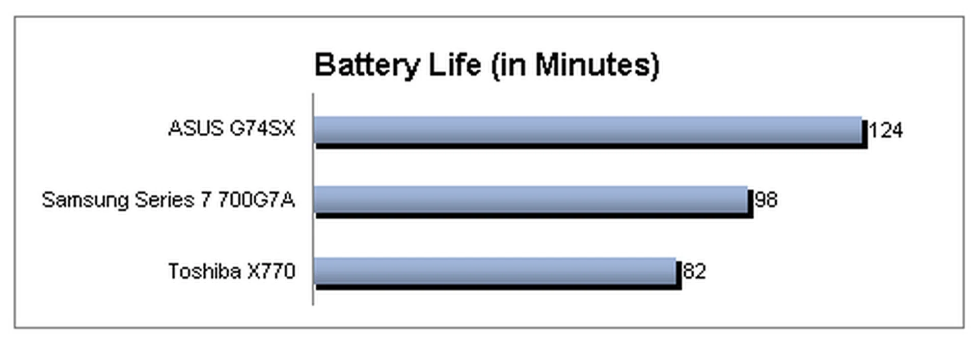 In our DVD video looping test to drain the system's battery (with screen brightness and audio both set to 50%), the G74SX lasted just over two hours, longer than both of its competitors and on par with the Dell Alienware M17X R3. Power consumption was about average for a 17.3-inch desktop replacement and slightly worse than Toshiba's X770, despite the longer battery life. It's not outstanding, but we would rank it as reasonable for a machine of this class and bulk.