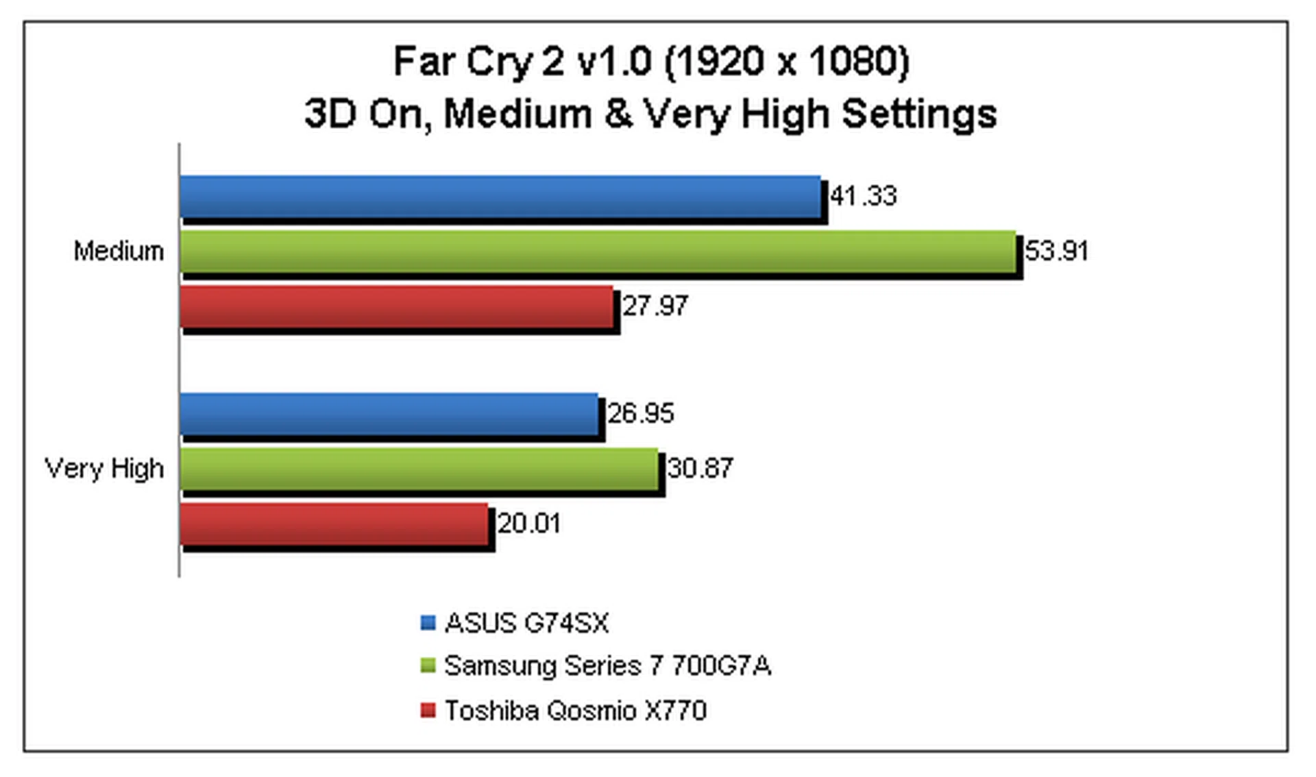With 3D Vision turned on, we did see the G74SX pull ahead of the X770, with a significant performance difference on both Medium and Very High settings. We found Medium settings to be playable with only minor frame rate drops during very intensive scenes. However on Very High settings, it was a different story, with frame rates dropping as low as 7 - definitely unplayable. The Samsung Series 7 700G7A was a much better choice for 3D gaming, with frame rates remaining acceptable even at Very High settings.