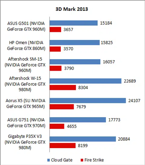 We have tested the ASUS ROG G501 using our usual suite of benchmarking utilities and games. For comparison, we will be including results from other 15-inch machines such as the Aftershock W15 and SM-15. And to see how the GeForce GTX 960M fares against the heavy hitters, we have included results of the ASUS ROG G751 and Gigabyte P35X V3, which are equipped with the NVIDIA GeForce GTX 970M and GTX 980M respectively.
