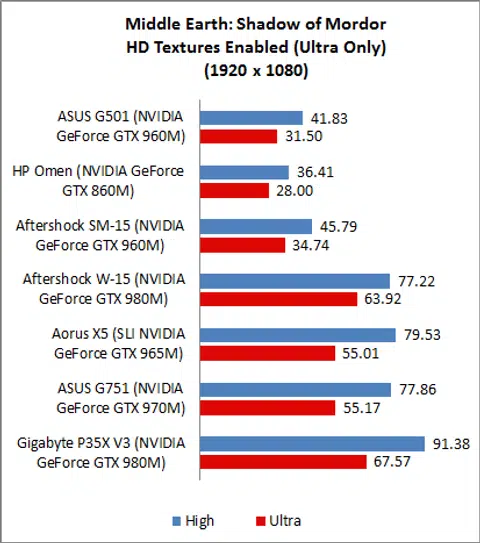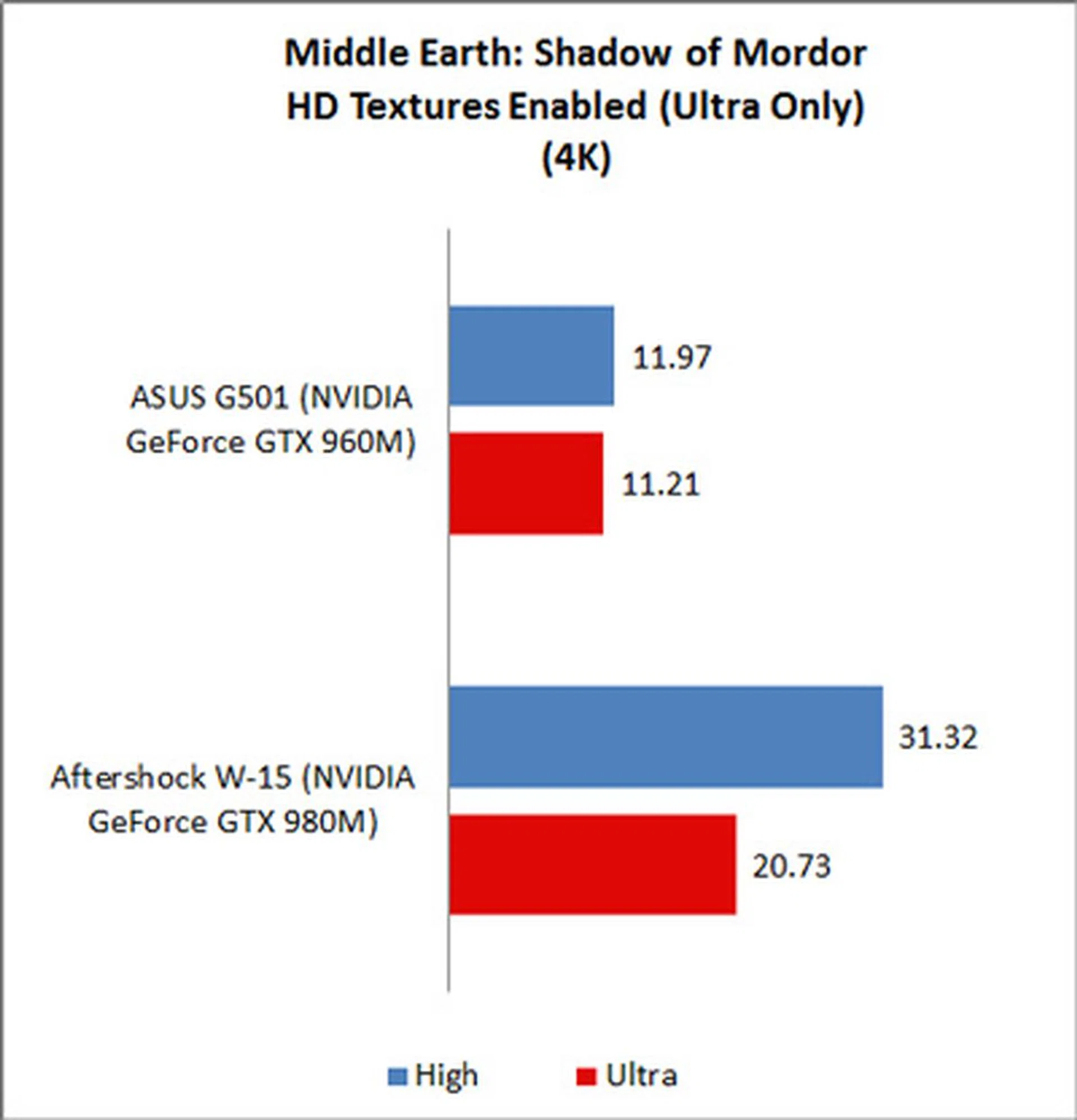 Expectedly, given the intensity of Shadow of Mordor, 4K gaming performance of the ROG G501 was dismal as it managed just around 11fps. It wasn’t much better for the Aftershock W-15 and its GeForce GTX 980M and it barely managed 31fps on “High” settings.