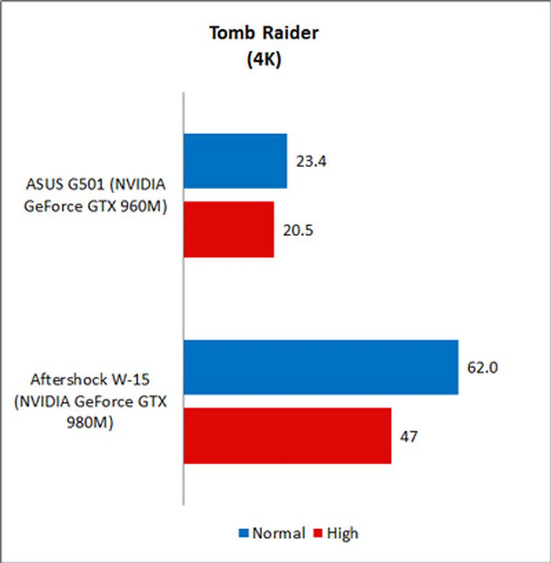Finally, looking at 4K gaming performance, it is clear that the GeForce GTX 960M is not quite up to snuff. At 4K resolution, the ASUS ROG G501 managed just 23.4fps on “Normal”. The GeForce GTX 980M in the Aftershock W-15, however, was more than capable, posting well above 30fps on both settings levels.