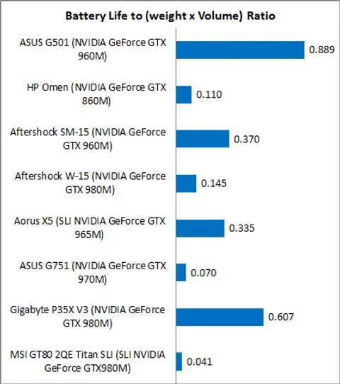 Our Portability Index factors in battery life, weight and volume so you can see which notebook is the most worthwhile to carry around. And bearing in mind the ASUS ROG G501’s slim dimensions, manageable weight and long battery, is it any wonder that it scored the highest amongst all the gaming notebooks? Its ratio of 0.889 is over twice as good as the HP Omen and Aftershock SM-15, and only the thin and light Gigabyte P35X V3 came close to challenging it.