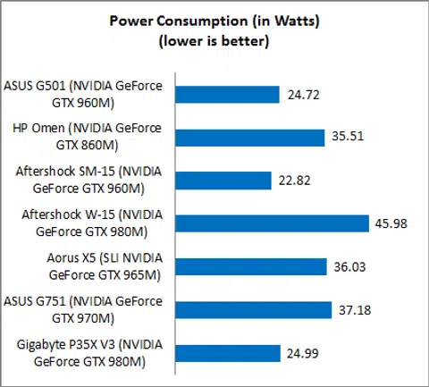 Diving deeper, we can see that its power consumption was measured at 24.72W, which is over 30% better than the HP Omen, but over 9% more than the Aftershock SM-15.
