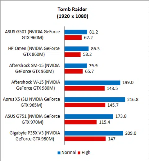 On to real world game benchmarks and the ASUS ROG G501 could not post a convincing win over the HP Omen. Their frame rates on Tomb Raider were very comparable, with the HP machine taking a 6% lead on “Normal” settings and the the ASUS machine taking a 7% lead on “High” settings. Scores between the ASUS ROG G501 and the similarly equipped Aftershock SM-15 were also very close.