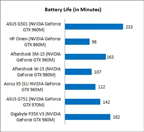 The ASUS ROG G501’s battery life was 233 minutes, which is very nearly 4 hours and impressive for a gaming notebook. Even the second placed Gigabyte P35X V3 was nearly an hour behind. The reason for the ROG G501’s amazing battery life can be attributed to the size of its battery, which is a whopping 96Wh - even greater than that of the ASUS ROG G751 which is a larger 17-inch notebook.