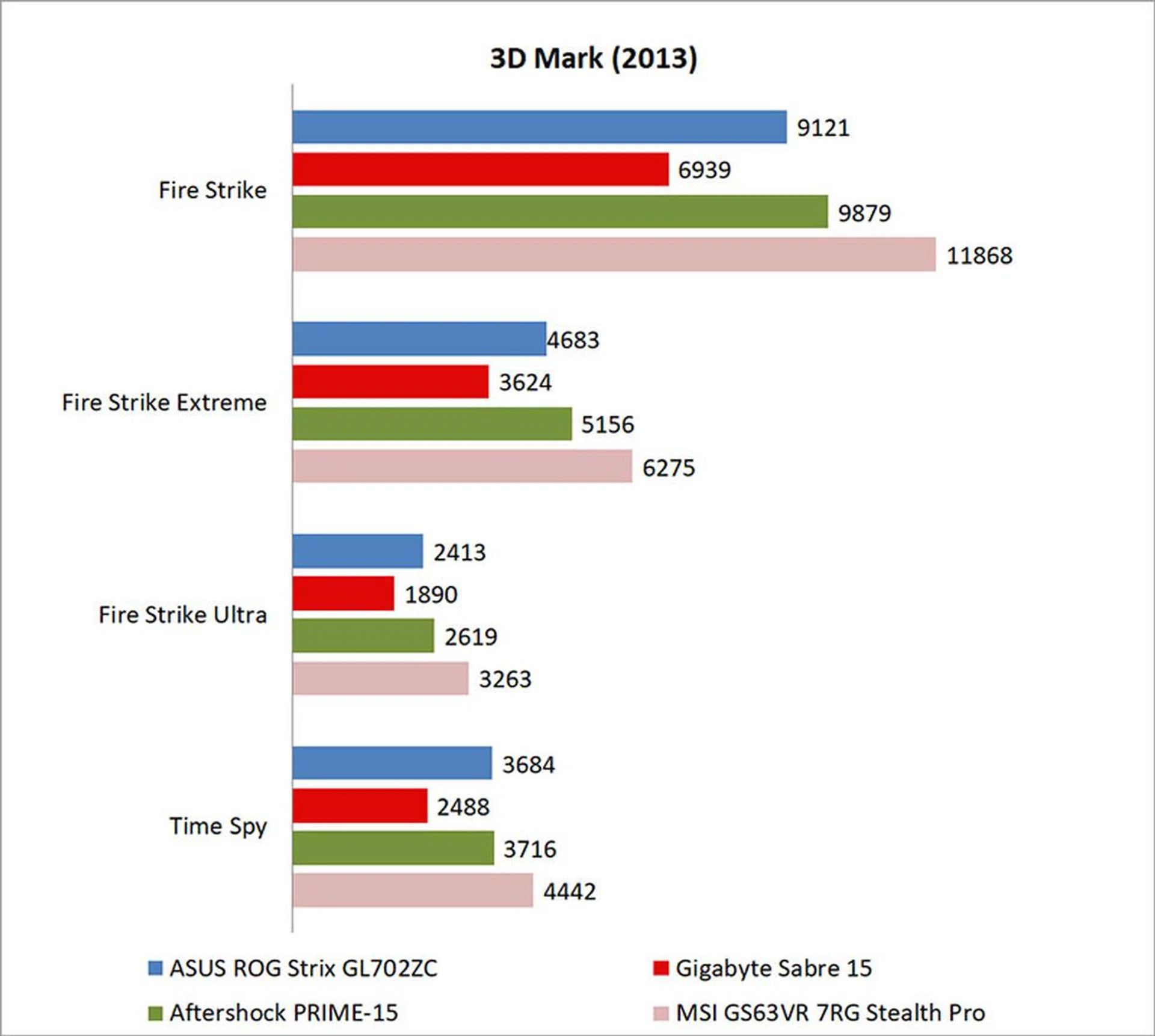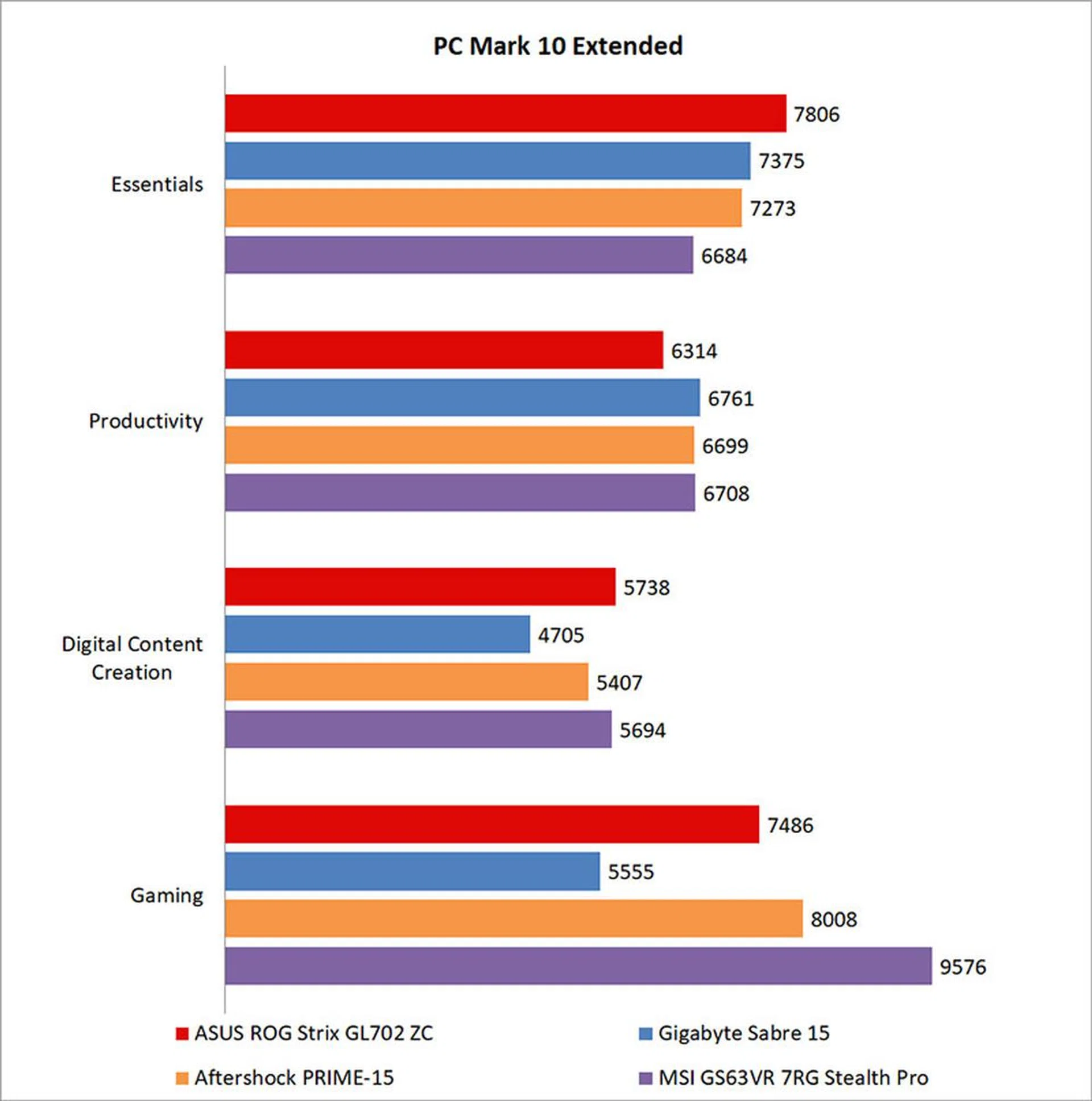 Despite its 8-core CPU, the ROG Strix GL702ZC fell right in the middle of the pack. In fact, the MSI laptop took the lead in terms of overall scores, largely thanks to the stronger gaming performance afforded by its NVIDIA GeForce GTX 1070 Max-Q GPU.