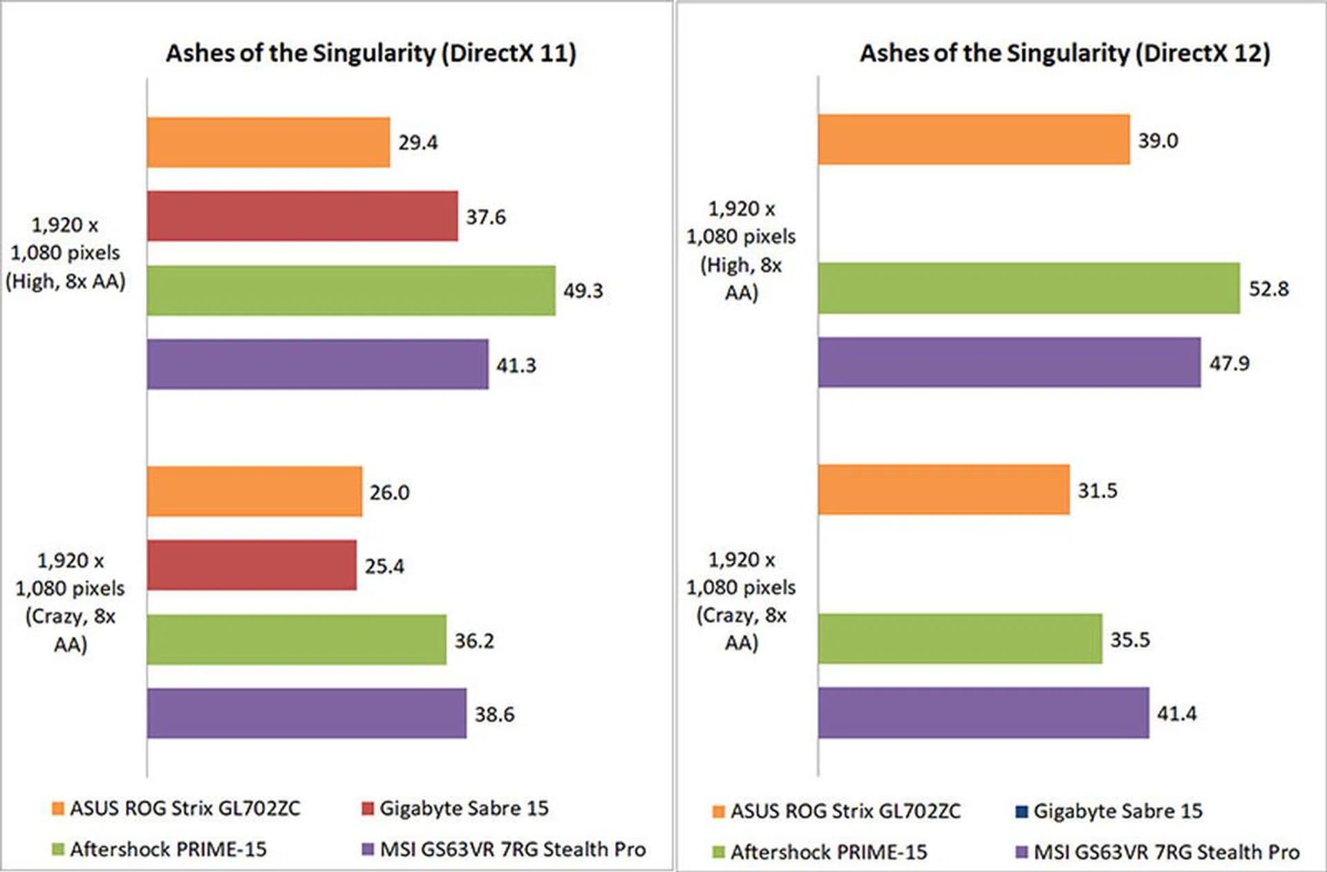 Previous testing has shown that Ashes of the Singularity appears to heavily favor the use of dual-channel memory, which the Aftershock is equipped with, so this partly accounts for the disparity. On the other hand, both the ASUS and MSI laptops are equipped with single-channel memory, which has half the bandwidth as a dual-channel configuration.