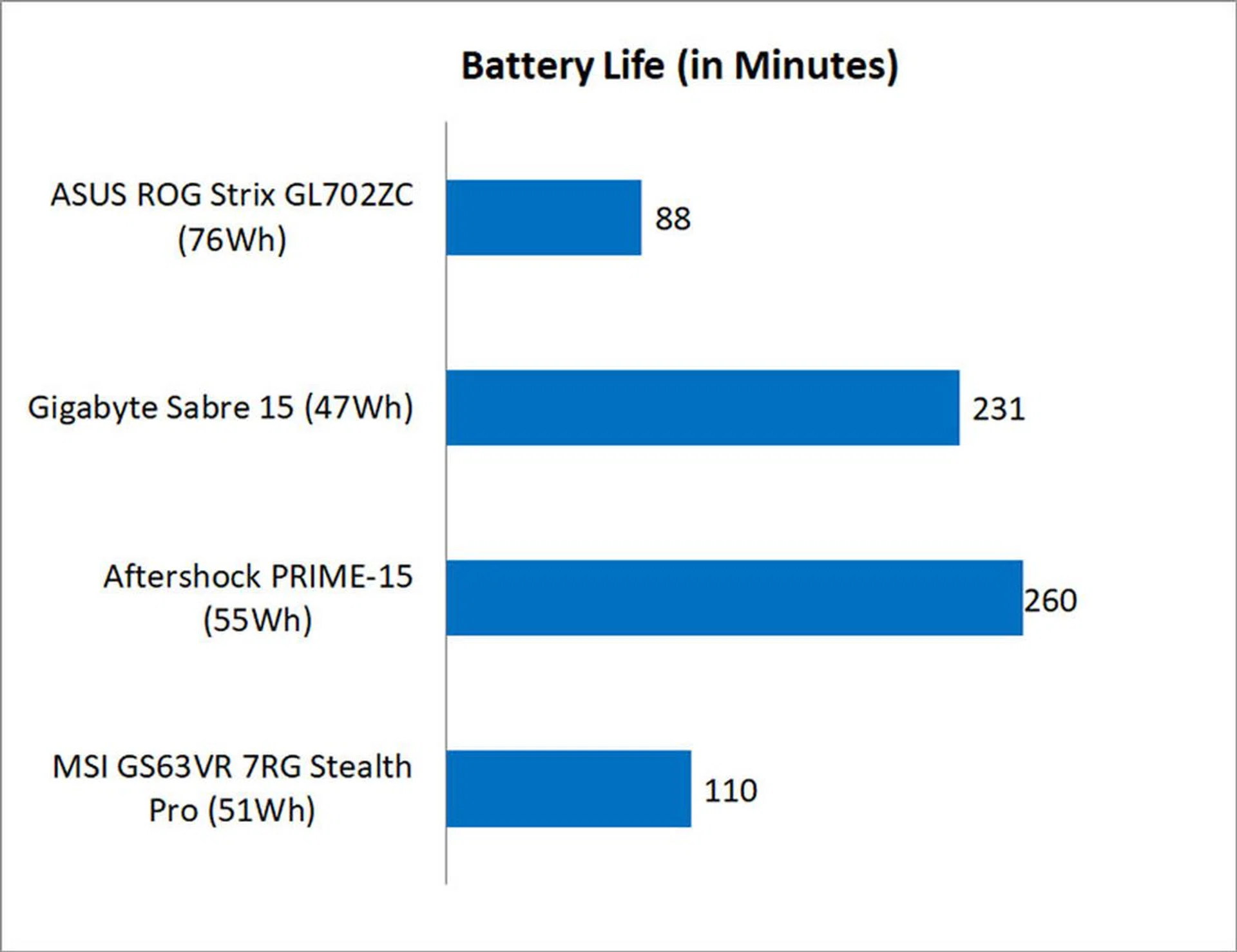 Unfortunately, battery life simply isn’t the ROG Strix GL702ZC’s strong suit, and the notebook performed rather poorly. The idea of a desktop Ryzen processor is certainly appealing, but the lack of any integrated graphics means that the laptop will be utilizing the discrete GPU at all times. There’s no way to switch over to an iGPU, and the higher power consumption clearly has a big negative impact on battery life.