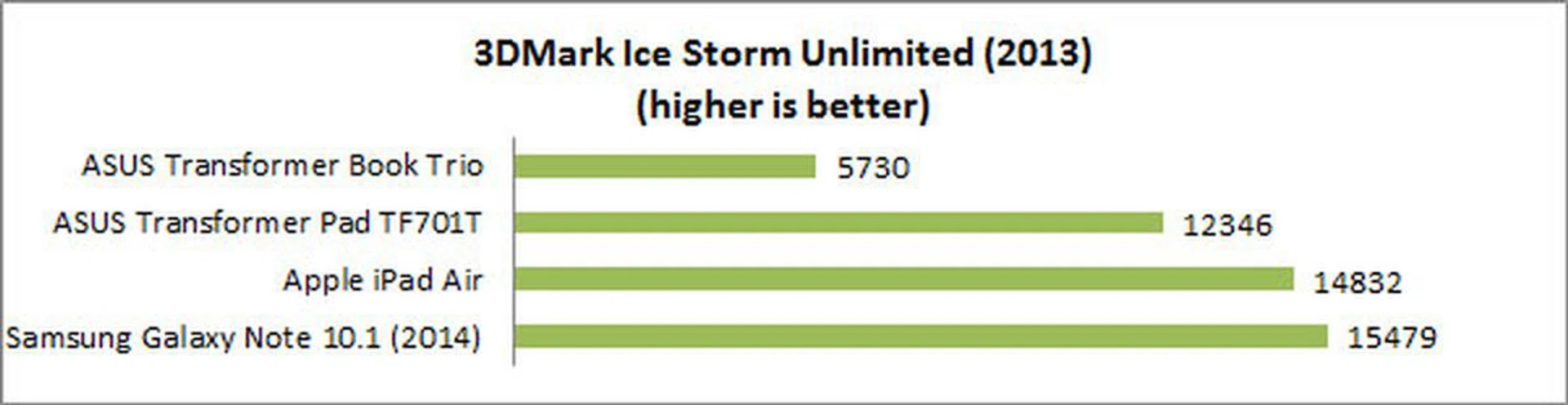 The Android tablet display of the Trio is meant to be a companion device that offers additional functionality, and comes with a dual-core Intel Atom Z2560 processor. To give you a gauge on how it performs compared to other recently launched flagship tablets, we've chosen an Android tablet from ASUS, the ASUS Transformer Pad TF701T, the Apple iPad Air, and the Samsung Galaxy Note 10.1 (2014 Edition).